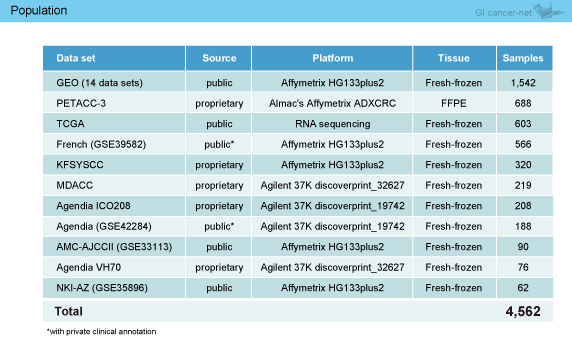 大腸癌はheterogeneityな癌であり、多くの研究グループがそれぞれ違う方法、異なった患者群で、遺伝子発現プロファイルによる大腸癌の分子サブタイピングを行っている (図1)。そこで、大腸癌分子サブタイプのコンセンサスの構築を目的に、参加する各研究グループに蓄積されたデータをまとめ、解析するためのコンソーシアムを作り、研究を行った。