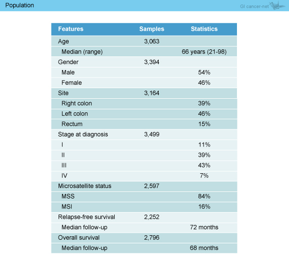 解析の結果、CMS1: 13%、CMS2: 35%、CMS3: 11%、CMS4: 20%、分類不能21%に分類された。その後、使用可能な臨床背景データを用い解析したところ、CMS1では女性・右側原発巣・マイクロサテライト不安定性 (MSI) の割合が多く、CMS4では進行期症例の割合が多かった。