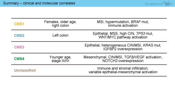 CRCSCは、さまざまなコンセプトや方法で大腸癌の分子サブタイピングを行っている名だたる各研究グループ (TCGA、MDACC、PETACC等) のデータを集結させ、共通のコンセンサスを構築し、膨大なデータからの統合解析を実施することが目的のプロジェクトである。本研究のために抽出されたデータを統合解析することにより、全体がCMS1~4、分類不能の5群に分類できた。結果は上述の如くであり、乳癌領域で臨床応用されているintrinsic subtypeに比べて、予後予測因子であるMSIに加え、現在注目されているimmune activation / infiltrationや多くのシグナル経路活性との相関が解析され、各群の予後との相関が示されていることが評価される。しかしながら、遺伝子発現解析がベースとなっているため、検体の条件や腫瘍のheterogeneity、多様な測定方法を踏まえると、臨床応用していくにはまだ問題が残されており、あくまでも「コンセンサス」であることを考慮しなければならない。