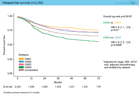 続いて臨床データとの解析を行ったところ、2,252例でのRFS (relapse-free survival) との相関解析では、CMS1が予後良好でありCMS4が不良であった (CMS4 vs. CMS1: HR=1.8, p=0.01) (図2)。