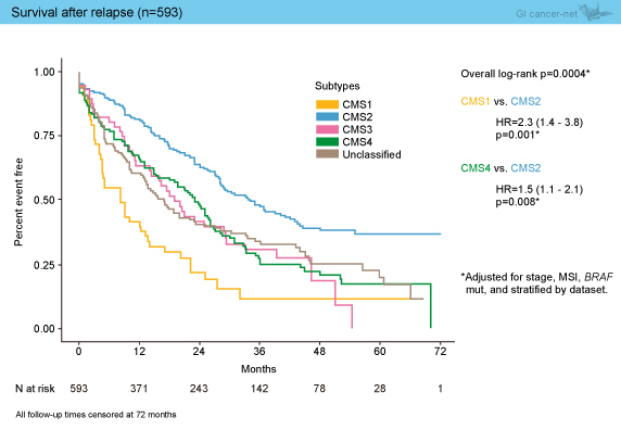 2,796例でのOSとの相関解析では、CMS2、CMS1が予後良好で、CMS4が不良であった (CMS4 vs. CMS2: HR=1.7, p=0.0004) (図3)。なお、興味深いことに、593例で再発後の予後を解析したところ、CMS2の予後が良好で、上述の解析でRFSが良好であったCMS1の予後が一番不良な結果であった (CMS1 vs. CMS2: HR=2.3, p=0.001) (図4)。