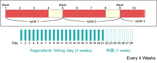 適格とされた760例が、Regorafenib群 (Regorafenib + BSC) とplacebo群 (placebo + BSC) に2:1の割合で無作為に割り付けられた。