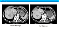 最後に、当院で抗EGFR抗体薬のre-challengeを受けた症例を紹介します。88歳の男性で、S状結腸癌です。抗EGFR抗体薬併用治療9サイクル後に最大の腫瘍縮小が認められましたが、11サイクル後に増悪が認められました。以降、化学療法は中止されていましたが、その後腫瘍の急速な増悪に対し抗EGFR対抗薬を再投与したところ、腫瘍縮小効果が認められました (図12)。