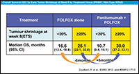 現在、抗EGFR抗体薬のバイオマーカーとしてKRAS statusが広く用いられているものの、KRAS 野生型においても、RAS 変異型のような抗EGFR抗体薬が有効でない症例が存在し、効果予測因子としての感度は不十分です。一方、治療マーカーとして「治療開始8週後における20%以上の腫瘍縮小 (ETS) 達成」が注目されています。CRYSTAL試験では、FOLFIRI + Cetuximab群におけるETS未達成例のOS中央値は18.6ヵ月、ETS達成例は30.0ヵ月と、ETS達成例で有意に延長しており (HR=0.53, p<0.001)、OPUS試験でも同様の傾向を示しています (HR=0.43, p=0.006)。また、PRIME試験においても、ETS達成例におけるOS中央値はFOLFOX群25.1ヵ月、FOLFOX + Panitumumab群30.0ヵ月とPanitumumab併用群で約5ヵ月の延長を認めたのに対し、ETS未達成例ではFOLFOX群16.6ヵ月、FOLFOX + Panitumumab群10.7ヵ月とPanitumumab併用群で約6ヵ月短く、抗EGFR抗体薬の効果予測因子としての可能性が示されました (表4)。