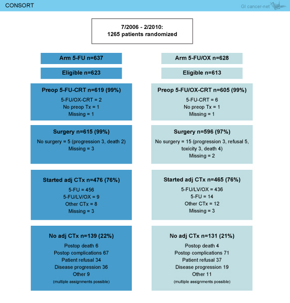 2006年7月~2010年2月までに1,265例が登録された。5-FU群637例、5-FU/L-OHP群に628例が無作為に割り付けられ、5-FU群623例、5-FU/L-OHP群613例が適格と判断され解析の対象となった。なお、両群の臨床病理学的背景に有意差を認めなかった。