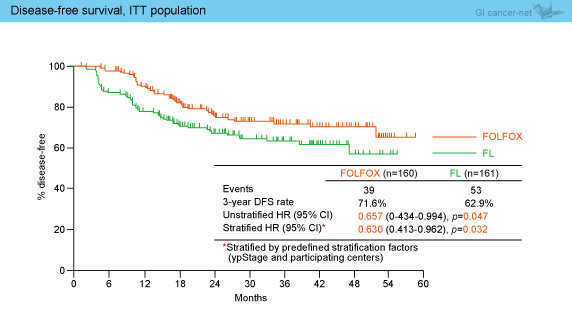 主要評価項目であるITT解析によるDFSは、3年DFSがFOLFOX群71.6%、FL群62.9%であり、有意差を認めた (HR=0.630, 95% CI: 0.413-0.962, p=0.032) (図2)。
