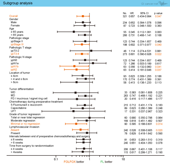 サブグループ解析のforest plotを図3に示す。多くの臨床病理学的因子においてFOLFOX群で良好な傾向にあったが、特にypT3-4、ypN1b、ypN2では有意に良好であった。また、術前化学放射線療法において効果なしまたは最小であった症例においてもFOLFOX群で有意に良好であった。これらの結果は、より進行した症例でFOLFOXが有効であることを示唆する。