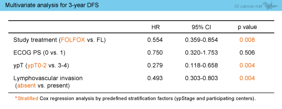3年DFSに対する多変量解析では、FOLFOXは独立した予後因子であった (HR=0.554, p=0.008) (表1)。