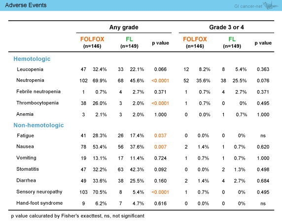 有害事象は、好中球減少、血小板減少、末梢神経障害、倦怠感、悪心の全gradeの発現率はFL群に比べてFOLFOX群で増加したが、grade 3/4の有害事象の発現率には差を認めなかった (表2)。