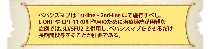 したがって、L-OHPまたはCPT-11の副作用によって治療継続が困難な症例では、sLV5FU2+ベバシズマブに切り替え、ベバシズマブをできるだけ長期間投与することが勧められる。